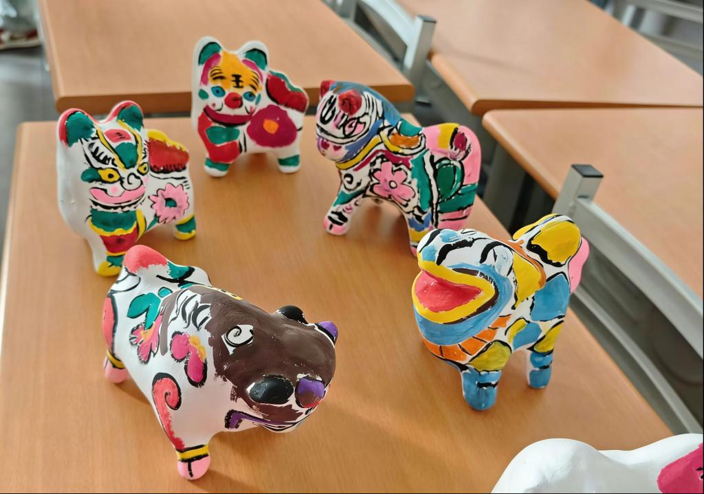 理论讲解后,实践体验环节正式开启。同学们在韩老师的指导下,专注投入泥塑勾线、上色环节。大家手持画笔,凝神静气、细心勾勒,以色彩为媒、以线条为韵,将创意与心绪融入作品之中,原本朴素的泥塑坯体,在一笔一画的精心创作下逐渐鲜活生动。现场氛围轻松愉悦,同学们在沉浸式创作中放下浮躁、专注当下,既体会到手作的乐趣,又在慢节奏的实践中舒缓学业压力,实现身心放松与心灵滋养。