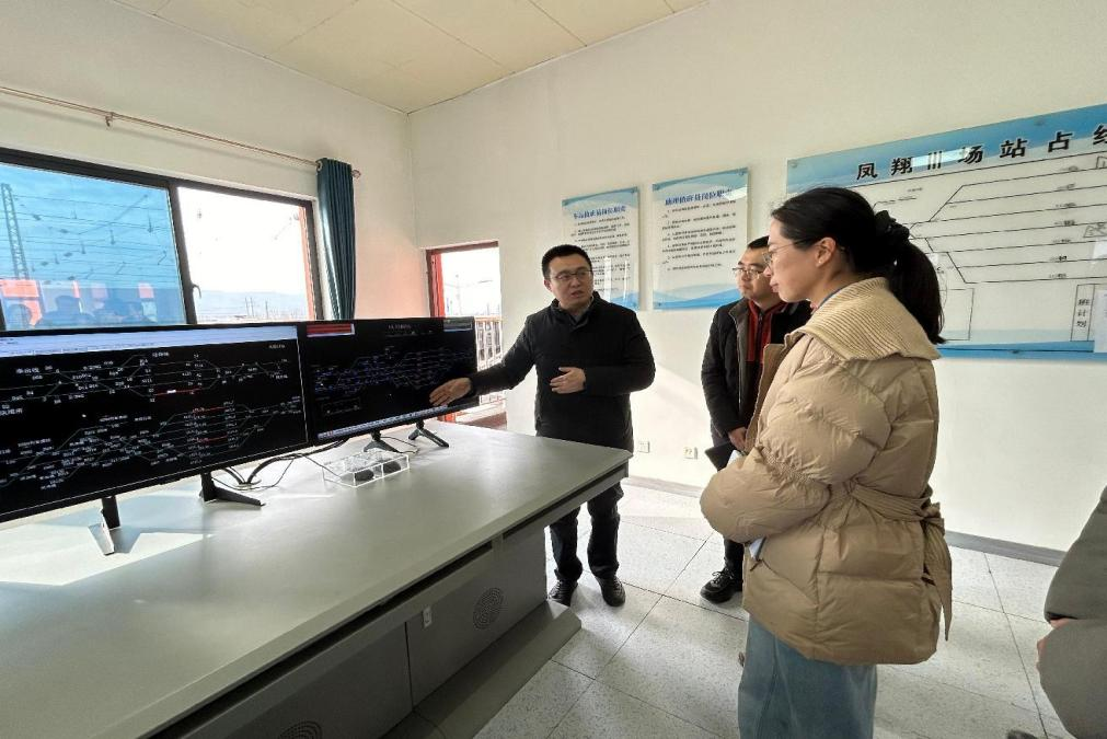 在长青铁路公司凤翔三场信号楼,学院教师们参观了凤翔三场行车室,通过联锁显示屏实地观测到列车运行图、线路占用情况、车辆位置等信息以及调度员们有条不紊地发出各项指令的全过程。
