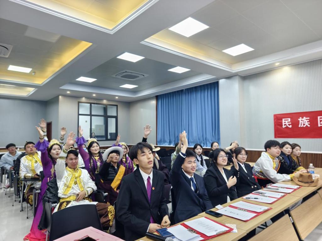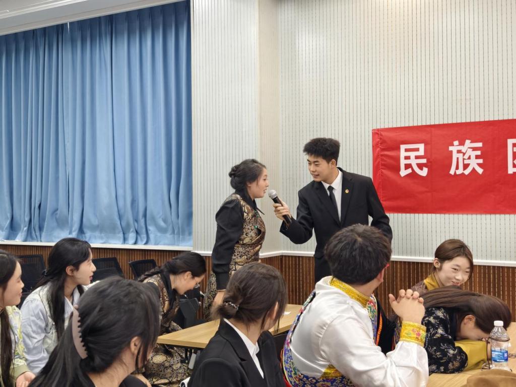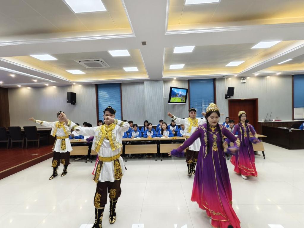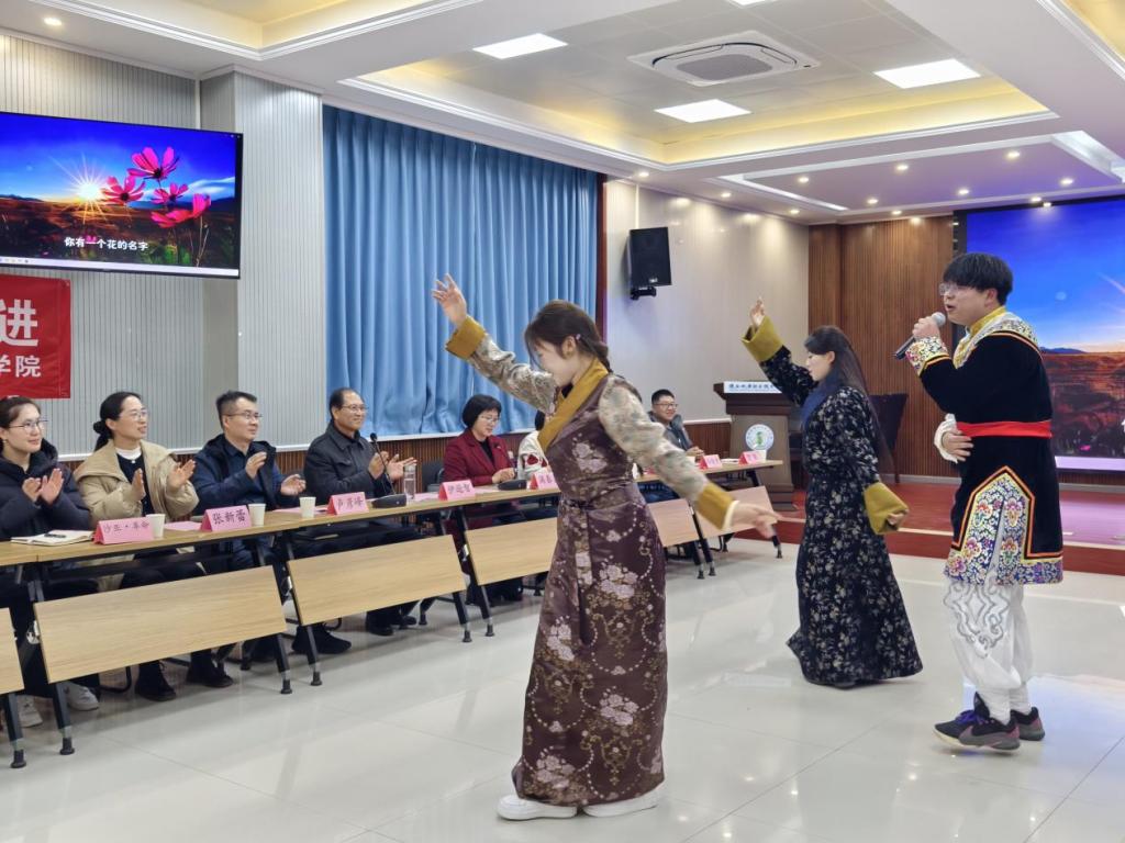为丰富座谈会氛围,增进各民族学生间的文化交流,现场还开展了精彩的节目表演。歌伴舞《卓玛》旋律优美,舞者身姿灵动,展现出浓郁的民族风情;朗诵《到延安去》情感饱满、气势昂扬,传递出青年学子传承红色基因的坚定信念;藏舞表演中,舞者们身着特色民族服饰,动作舒展流畅,尽显藏族文化的独特魅力;新疆舞表演则热情奔放,欢快的节奏与优美的舞姿赢得了在场人员的阵阵掌声。一个个精彩的节目,不仅是各民族文化的生动展示,更是各民族学子团结友爱的鲜活体现。