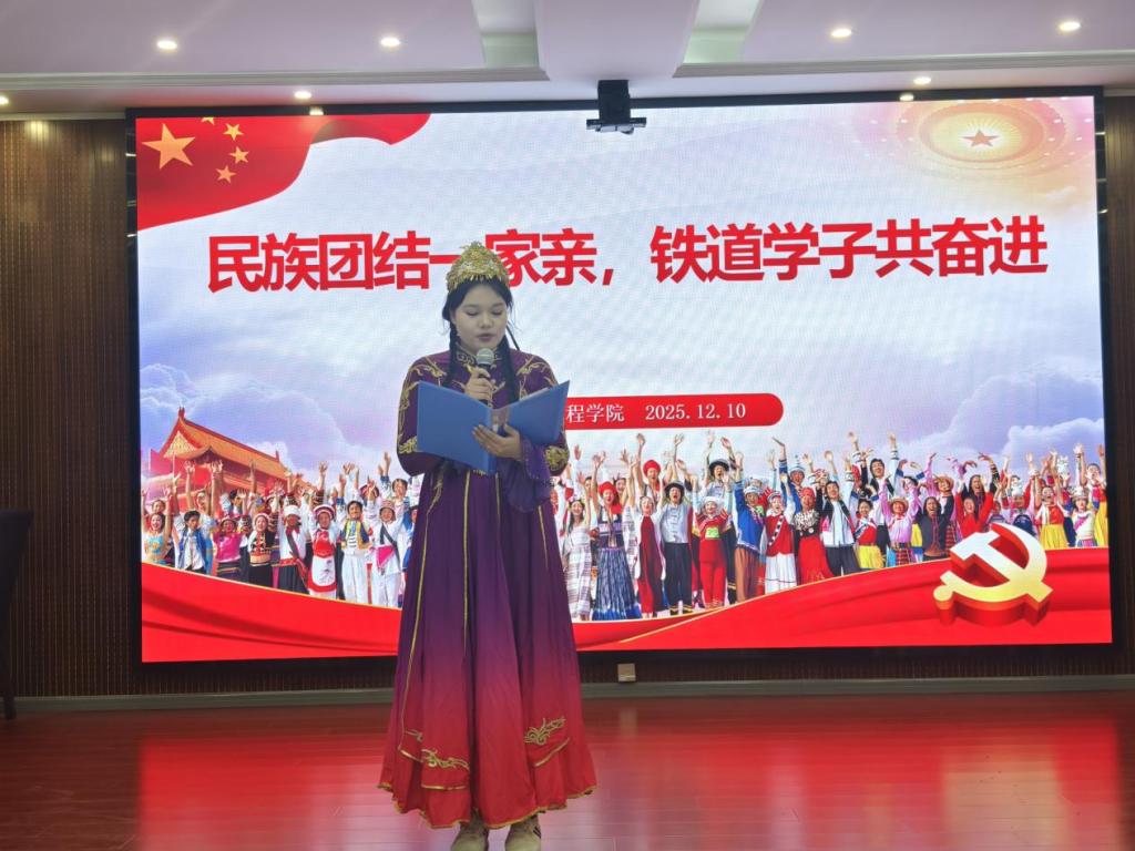 随后,24建筑工程2班的少数民族学生代表麦地娜木・努尔买买提发言。她结合自身在学校的学习与生活经历,分享了在学院关怀下的成长感悟,言语间充满了对学校和老师的感恩之情,也展现出少数民族学子积极向上、努力奋进的精神风貌,让在场人员深切感受到铁道工程学院为学生搭建成长平台的用心,以及学生们在校园里的幸福感。