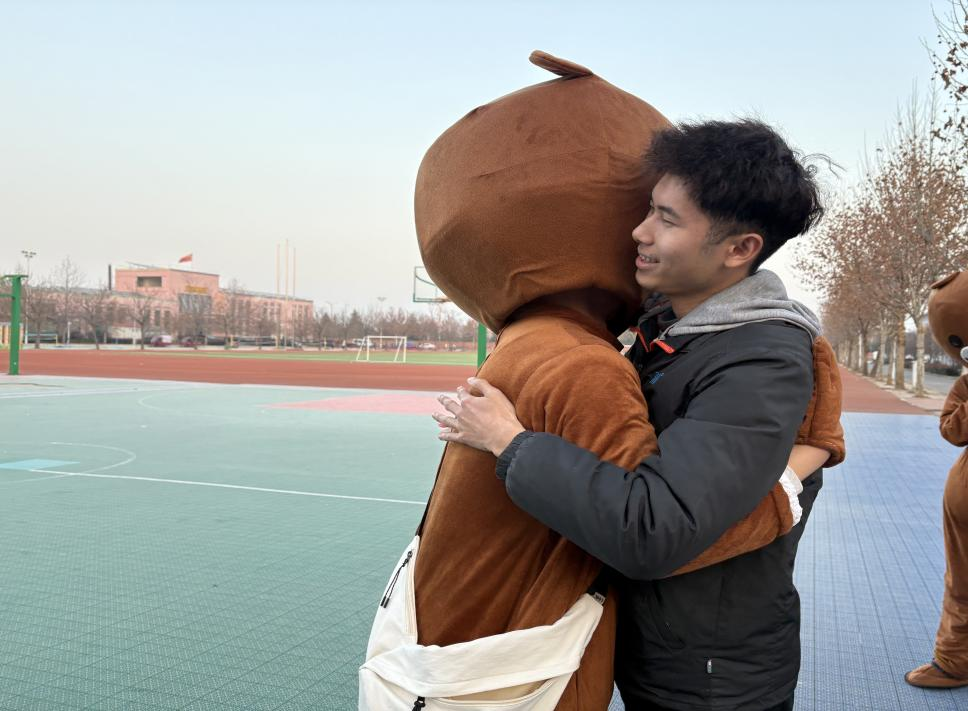 活动前期,学院学生会精心筹备,在现场设置“暖心拥抱站”,并安排身着布朗熊玩偶服的“抱抱使者”热情迎宾,让过往师生感受到满满的诚意与暖意。学院辅导员鼓励大家勇敢敞开怀抱,在真诚互动中感受温暖与支持。