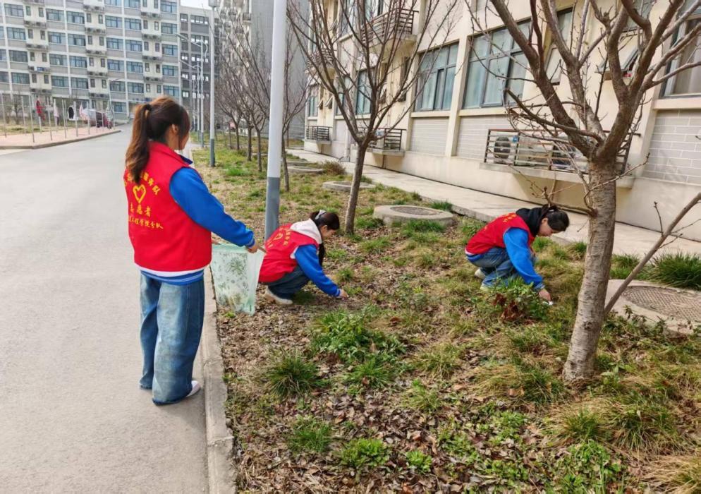 最后,志愿者们走进学生公寓区域,聚焦宿舍周边花坛、绿植区域及楼道公共空间,开展环境整顿工作。他们仔细清理花坛内的杂草、纸屑和废弃杂物,清理公共区域垃圾,用双手为同学们打造了干净、舒适的居住环境。